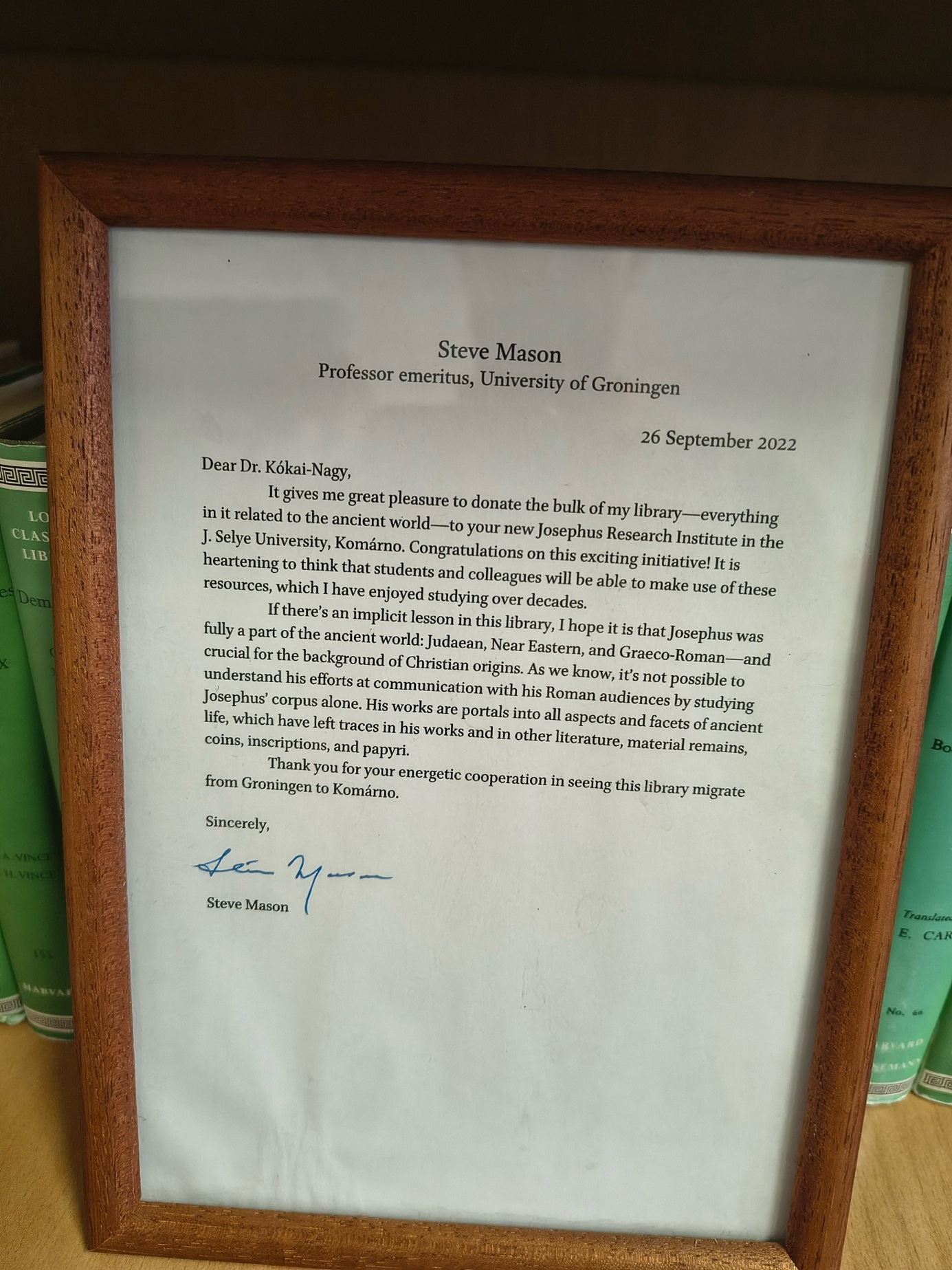 Egy baráti beszélgetés alkalmával felvetettük Steve Masonnak, hogy amennyiben esetleg nyugdíjazása után nem tudna mit kezdeni a könyveivel, akkor mi roppant módon örülnénk azoknak Komáromban és kiváló hasznát vennénk. Nem lehetünk elég hálásnak a kiváló groningeni professzornak, aki hezitálás nélkül nekünk ajándékozta teljes könyvtárát.